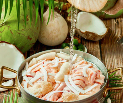 - 按比例搭配椰子水与泉水,煮沸后加入椰肉;